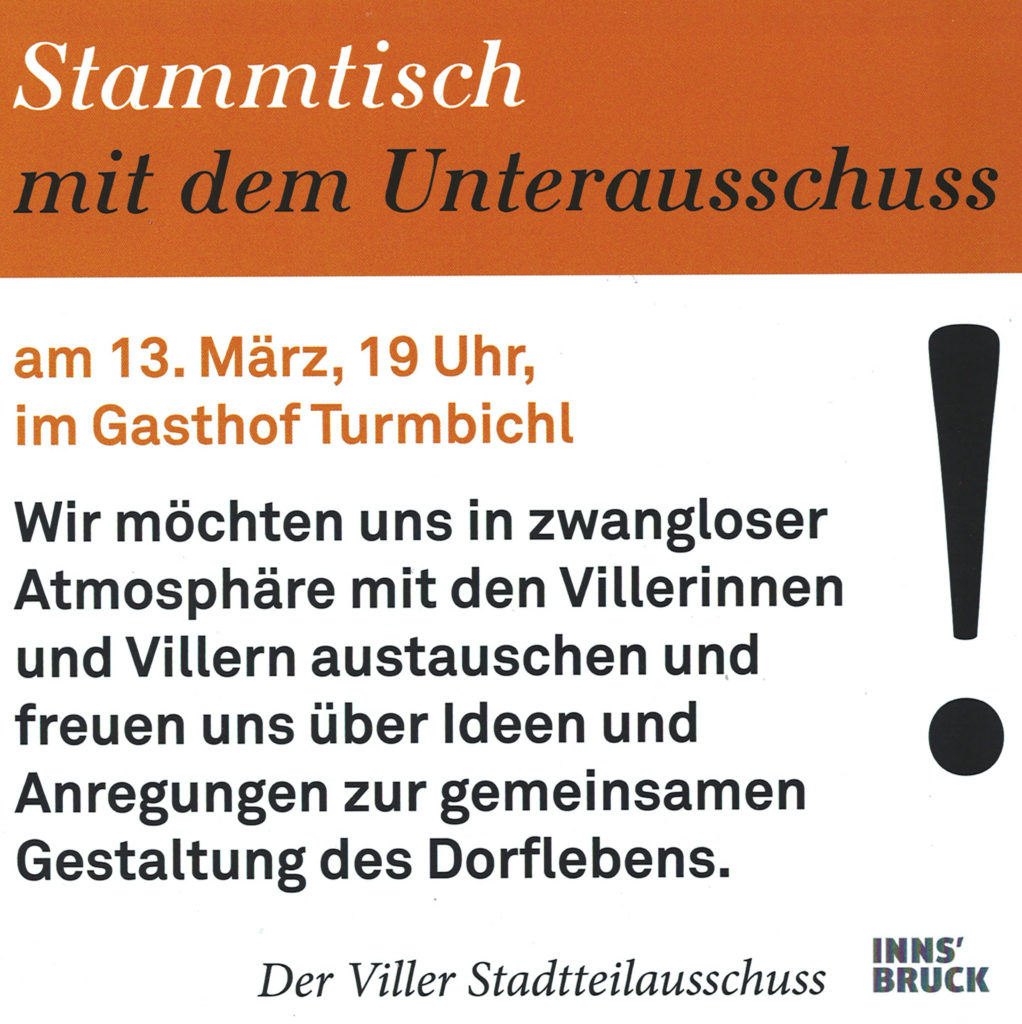 Zum zweiten Mal findet am 13. März im Gasthof Turmbichl ab 19 Uhr ein Stammtisch mit den Mitgliedern des Viller Unterausschusses statt. In zwangloser Atmosphäre wollen wir uns mit den Villerinnen und Villern austauschen, auch Anregungen und Ideen zum Dorfleben haben hier ihren Platz.